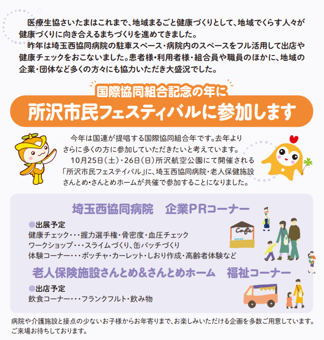 10/25(土)・26(日)所沢航空記念公園で開催される【所沢市民フェスティバル】に、埼玉西協同病院・老人保健施設さんとめ・さんとめホームが共催で参加することになりました😊😊😊
