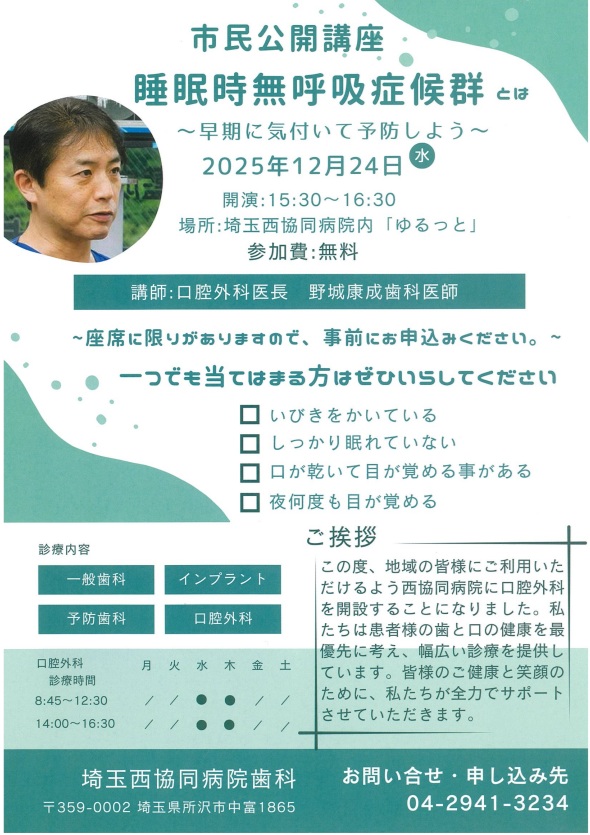 12月24日(水)15:30~ 埼玉西協同病院1階 地域コミュニティースペース“ゆるっと”にて、市民公開講座「睡眠時無呼吸症候群とは」をおこないます。